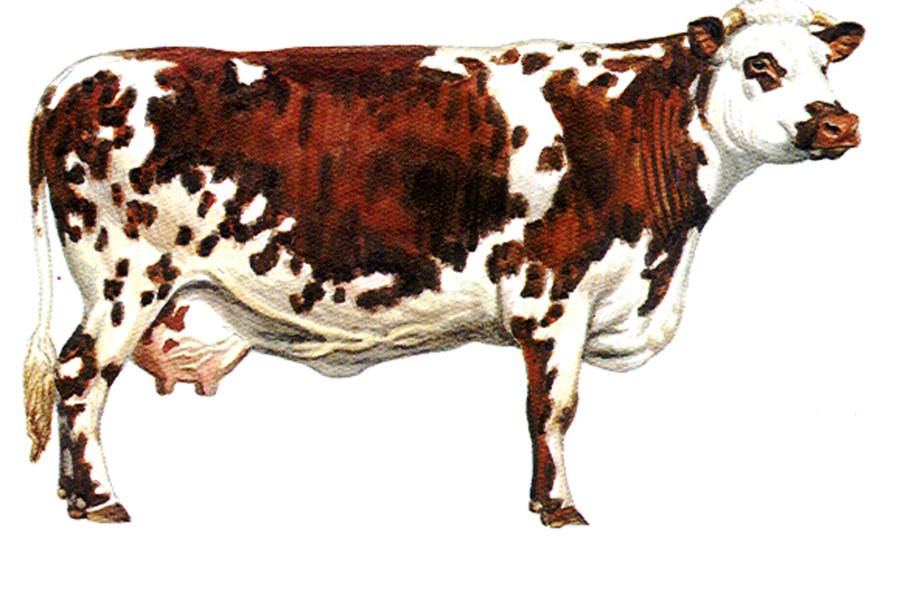 De robe dite « tricolore » avec « lunettes » autour des yeux et du mufle, la vache normande serait la descendante de bovins amenés par les Vikings au
